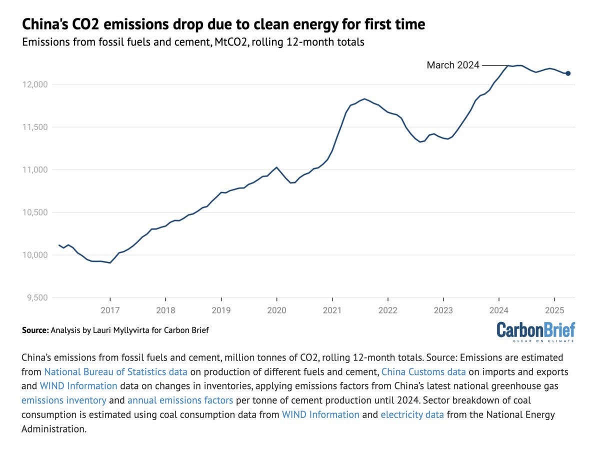 For the first time in China's modern history, the country's CO2 emissions have dropped for a full year that was characterized by growth in energy demand. This milestone occurred because rapid growth in clean energy production finally began outpacing growth in total energy consumption.