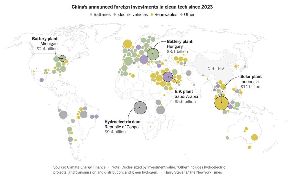 China’s contribution to decarbonization abroad isn’t just happening via exports of clean energy technology. The country has also become a global vehicle for clean energy investment. Chinese companies have announced a staggering $168 billion in foreign investments in clean energy manufacturing, generation and transmission since 2023. Notable projects include an $11 billion solar plant in Indonesia, a $9.4 billion hydroelectric dam in Congo, and an $8.1 billion battery plant in Hungary.