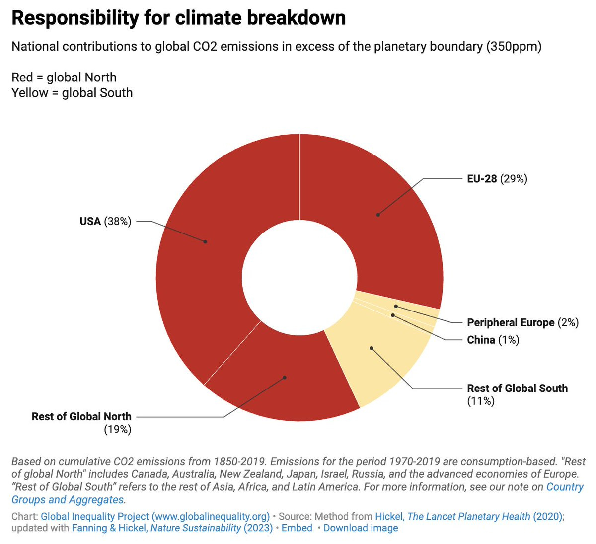 Researchers have in fact calculated different regions' responsibility for climate breakdown based on cumulative emissions. They have done this by dividing the global safe carbon budget into national 'fair shares' on a per capita basis, then assessing each country's historical emissions against these allocated shares. The results are striking: China is responsible for a mere 1% of climate breakdown. By contrast, the United States bears responsibility for 38% and the European Union for 29%.