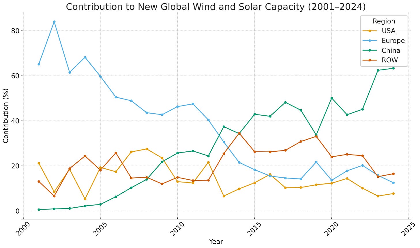 China's clean energy surge becomes even more impressive when we examine new installed capacity. In wind and solar power, China's contribution to new global capacity has grown from a mere 0.6% in 2001 to 63.3% in 2024. Meanwhile, the United States and Europe — regions largely responsible for climate breakdown — have been investing comparatively little in these critical sectors.